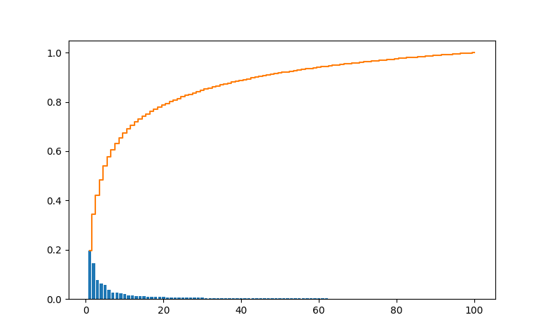 对这四百张人脸图像进行主成分提取,将每一幅图像拉成一列,组成数据集合(112*92,400),进行主成分提取。各方差所占比例分布如下: