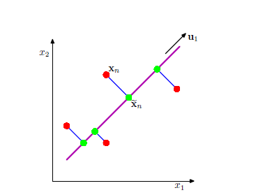 对于一组样本数据 ,其中 。设是一个 D 维向量的变量,首先考虑将其投影到一维空间,使用 D 维向量定义这个一维空间的方向。由于只考虑方向,可以假定