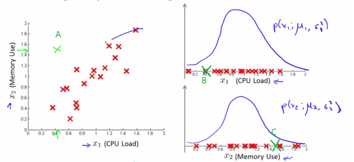 传统模型对于图中所给数据进行异常检测,会按照图中右侧的给出的方式,在每个维度都建立单元高斯模型,之后做乘积运算,得到模型之后,通过设置阈值,进行异常值检测。